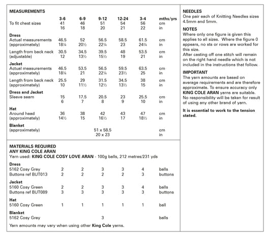 King Cole Dress, Jacket, Hat, & Blanket Knitted in Cosy Love Aran 6049