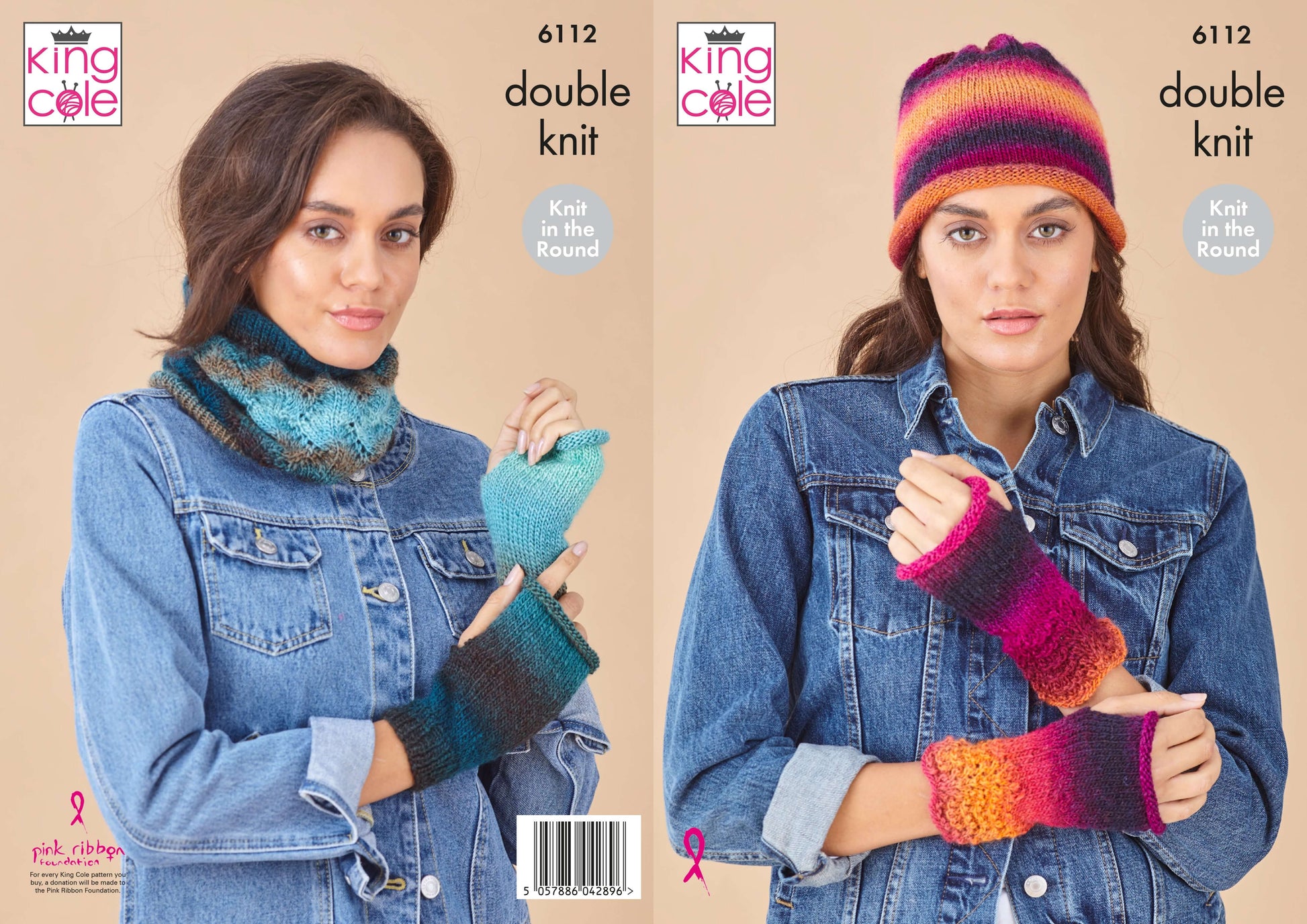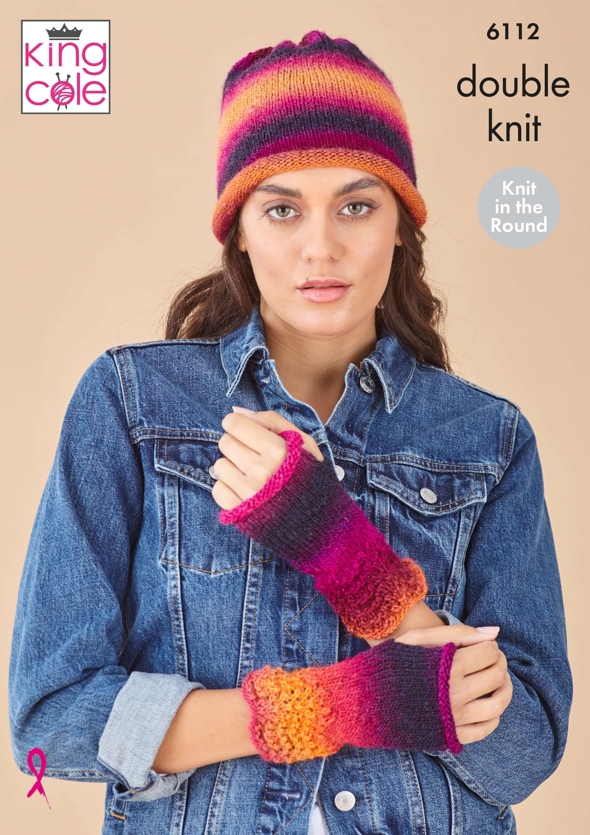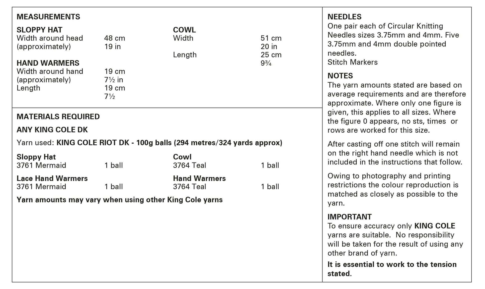 Pattern includes instruction to knit a sloppy hat, cowl and two designs of hand warmers. All designs have been knitted in King Cole Riot.