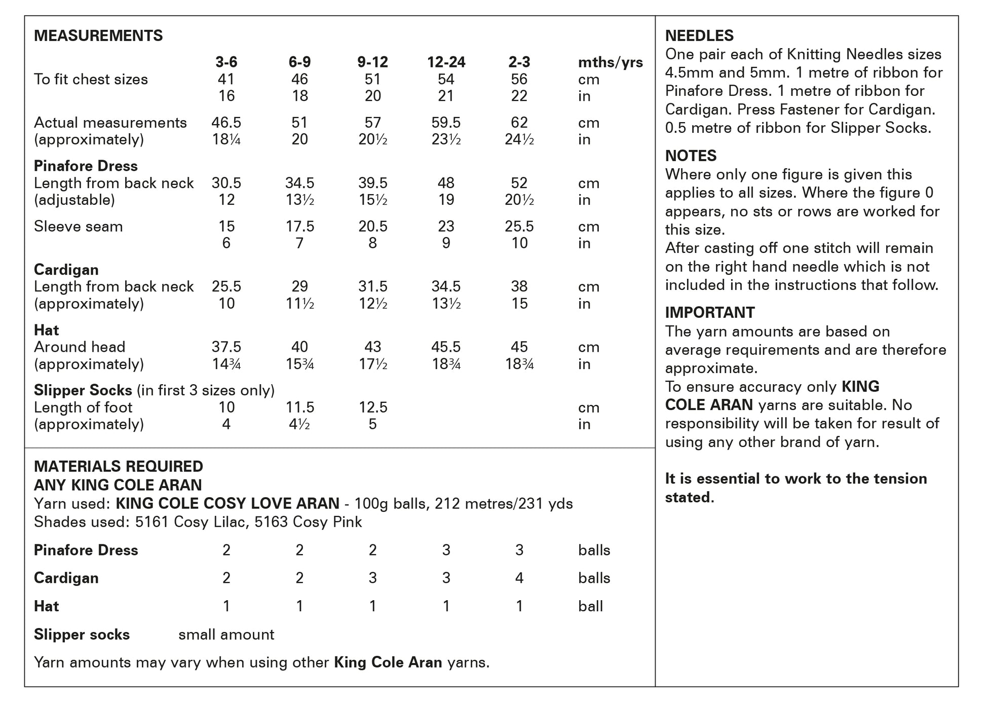 The pattern includes instructions for a baby pinafore dress, cardigan, hat and slipper socks knitted in King Cole Cosy Love Aran.